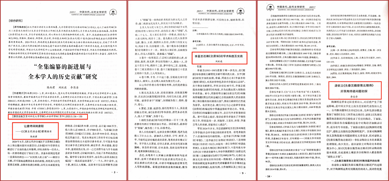 人大复印《中国古代、近代文学研究》2025年第7期转载了我刊陈尚君、刘跃进、李思清老师的笔谈文章《“全集编纂的新进展与全本学人的历史贡献”研究》。该组笔谈以专题特稿形式原发于本刊2025年第3期,责任编辑为颜同林、金航。在笔谈的编者按中认为中国古典诗文全集编纂历来成果丰硕,先唐诗歌领域,明代冯惟讷《古诗纪》、近人丁福保《全汉三国晋南北朝诗》及逯钦立《先秦汉魏晋南北朝诗》奠定重要基础。唐五代诗歌全集编纂自清代《全唐诗》问世后,学者持续深耕补编与辑佚,其中,陈尚君辑校的《全唐诗补编》,周勋初、傅璇琮、郁贤皓、吴企明、佟培基主编的《全唐五代诗》十卷本等均为关键成果。2024年8月,陈尚君纂校的《唐五代诗全编》由上海古籍出版社出版发行,引起了学术界的广泛关注。基于此,本刊特约了三位专家的最新研究成果,即陈尚君的《让唐诗回到唐朝——记〈唐五代诗全编〉纂辑始末》,刘跃进的《李嘉言改编〈全唐诗〉的学术构思及实践》和李思清的《逯钦立〈先秦汉魏晋南北朝诗〉所录陶诗诸问题初探》。三篇文章从不同角度深入解读《唐五代诗全编》的学术价值,并回顾前辈学人李嘉言、逯钦立在唐五代诗、先唐诗歌全集编纂中的设想、实践与学术收获,为古典文学整理研究提供了重要参考。
