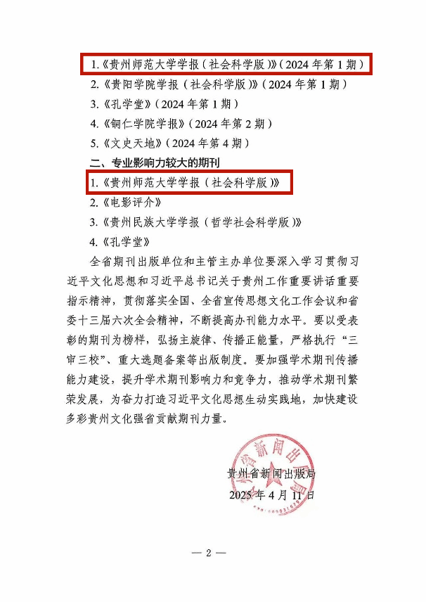 近日,贵州省新闻出版局公布了《关于对阅评质量优秀及专业影响力较大的期刊进行通报表扬的通知》,《贵州师范大学学报(社会科学版)》获得“内容质量优秀”和“专业影响力较大的期刊”两项重要荣誉。