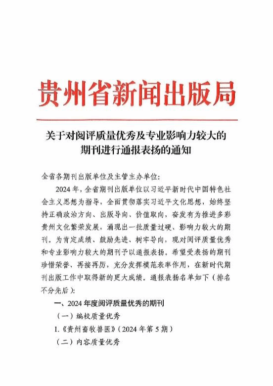 贵州省新闻出版局十分注重对本省出版期刊的审阅和管理,为肯定成绩、鼓励先进、树牢导向,开展了2024年度期刊阅评工作,对阅评质量优秀和专业影响力较大的期刊予以通报表扬。在本次阅评活动中,本刊获得两项荣誉,是贵州省新闻出版局对本刊办刊质量的认可和鼓励。近年来,我刊持续坚持弘扬主旋律、传播正能量,注重理论学习,加强业务素养,严格执行“三审三校”、重大选题备案等出版制度,在刊物编校质量、刊文影响力等诸多方面都有了较大的进步。本次表彰既是对编辑部全体老师工作的肯定,也是对我们未来的鞭策,我们将珍惜荣誉、再接再厉,在新时代期刊出版工作中取得新的成绩。