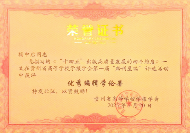 近日,贵州省高等学校学报学会第一届“黔刊星编”评选结果正式揭晓。此次评选设立了多个奖项类别,包括精品社科期刊、精品自科期刊、优秀社科期刊、优秀自科期刊、最具影响力栏目、最佳新媒体平台,以及优秀编辑学论著、优秀编辑和优秀编辑团队。贵州师范大学学报编辑部在此次评选中表现突出,多个类别获奖。其中,《贵州师范大学学报(社会科学版)》荣获6个奖项,《贵州师范大学学报(自然科学版)》荣获5个奖项,均包括集体和个人,成为全省高校学报获奖类别和奖次最多的单位之一。