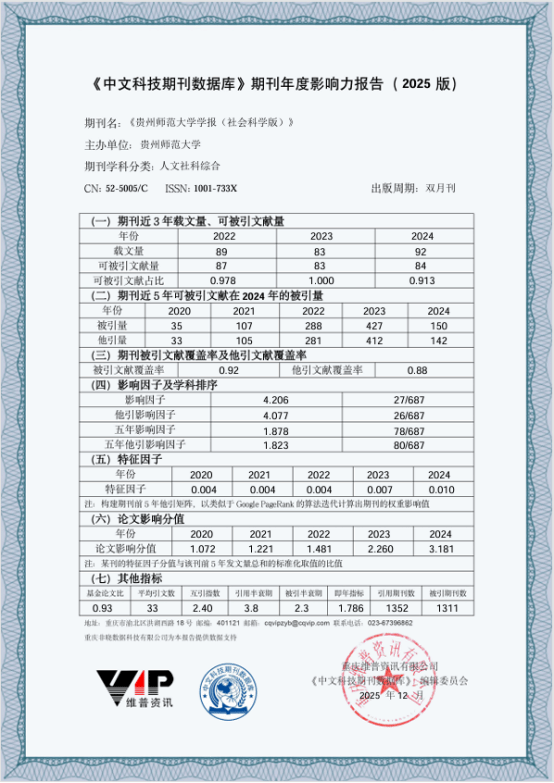 根据《中文科技期刊数据库》期刊年度影响力报告(2025年版)显示,本刊影响因子为4.206,在687种人文社科综合学科期刊中位列前27名;他引影响因子为4.077,在687种人文社科综合学科期刊中位列前26名。